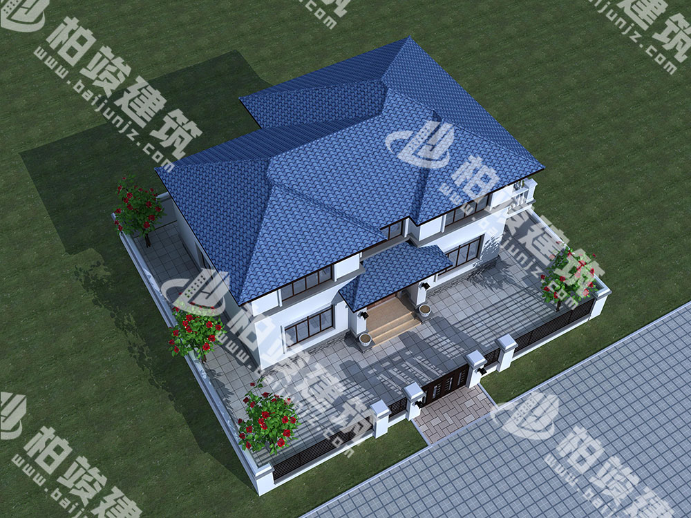 屋顶造型:蓝色釉面瓷瓦铺设坡形屋顶,极具几何美感