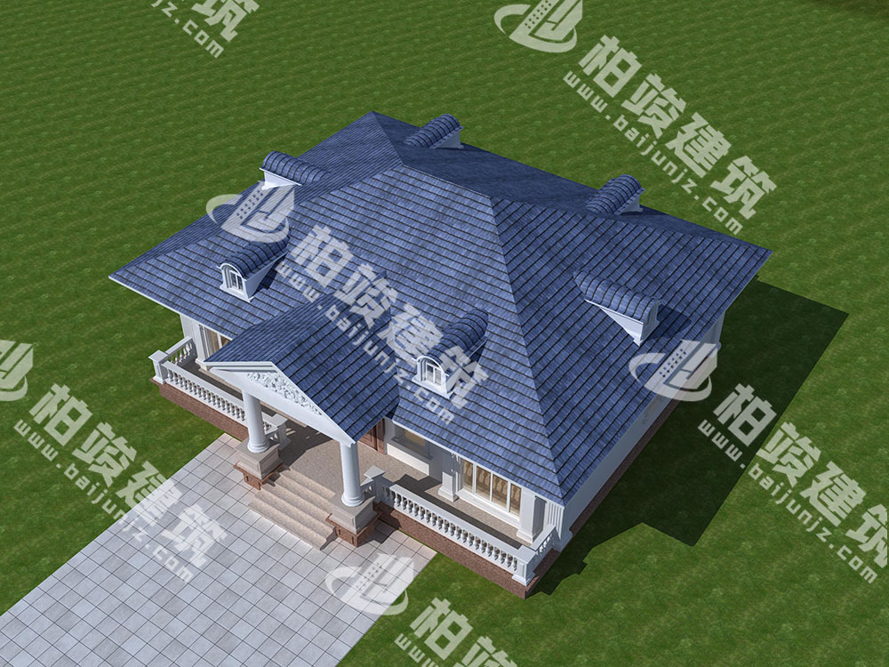 屋顶造型:墨蓝色瓦片铺设坡形屋顶,大气优雅